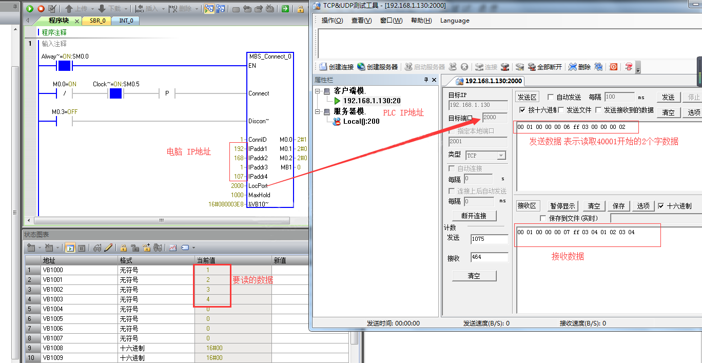 Der Rückgabewert ist 00 01 00 00 00 07 ff 03 04 01 02 03 04. Die ersten 7 Bytes sind der MBAP-Nachrichtenkopf, 03 Funktionscode-Lesung, 04 Datenbytes, 01 02 03 04 stellt den Dateninhalt dar.