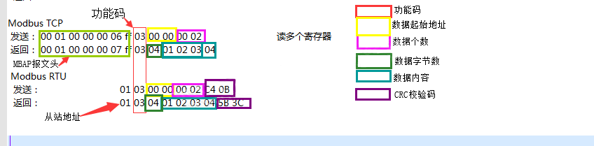 Die beiden Protokolle sind sich sehr ähnlich. Nehmen wir als Beispiel das Lesen mehrerer Halteregister, um den Unterschied zwischen ihnen zu verdeutlichen: