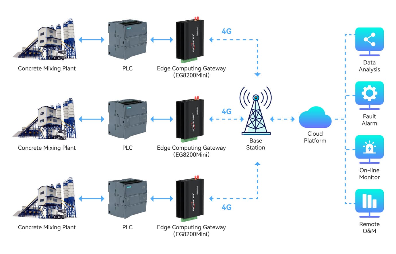 The solution utilizes 4G industrial wireless gateway (EG8200Mini) as the communication core, connecting to a dedicated cloud monitoring center platform for the mixing plant to achieve remote monitoring of the mixing plant equipment. The EG8200Mini gateway is installed in the mixing plant control room and connects to the main control PLC of the mixing plant via Ethernet or serial port. Environmental sensors and cameras are connected to the gateway via I/O or network.