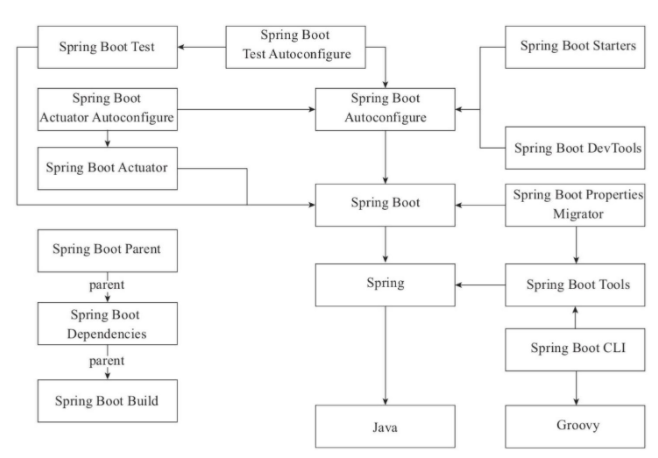 Spring Boot Parent is Spring Boot and the Parent project in the figure relies on the Spring Boot project. Similarly, for the sake of clear structure, the relevant dependencies are not shown in the figure.