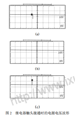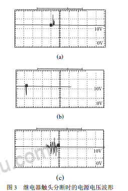 Figure 2 (a), (b), and (c) respectively show the power supply voltage waveforms at the moment when the normally open contact of the relay is turned on. It can be seen that there are sometimes jumping spikes on the power supply voltage. However, the amplitude, polarity, number and presence of spikes are random, which is consistent with the irregularity of system malfunctions.