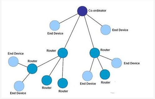 The tree topology includes a Co-ordinator and a series of Router and End Device nodes. Co-ordinator connects a series of Routers and End Devices, and its sub-node Routers can also connect a series of Routers and End Devices. This can be repeated for multiple levels. The structure of the tree topology is shown in the figure below:
