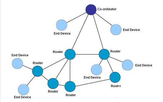Mesh topology includes a Co-ordinator and a series of Routers and End Devices. This form of network topology is the same as a tree topology; please refer to the tree network topology mentioned above. However, mesh network topology has more flexible information routing rules, and routing nodes can communicate directly with each other when possible. This routing mechanism makes the communication of information more efficient, and means that once a problem occurs on one routing path, the information can be automatically transmitted along other routing paths. A schematic diagram of a mesh topology is shown below: