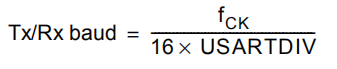 Among them, fck is the USART clock, and USARTDIV is an unsigned fixed-point number stored in the baud rate register (USART_BRR). The DIV_Mantissa[11:0] bits define the integer part of USARTDIV, and the DIV_Fraction[3:0] bits define the fractional part of USARTDIV.