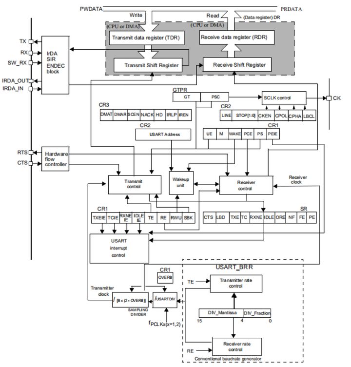 On current microcontrollers, the digital circuit control part has been encapsulated, and now you only need to operate the corresponding bits of the corresponding register to control the UART. Taking the chip STM32F411 in hand as an example, the following figure is the UART block diagram: