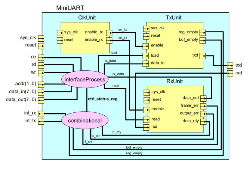 This picture is a module diagram of UART modeling using System C when I was in school. For the interface part, the important ones are Tx, Rx data output, receiving interface, and clk provides the initial clock signal of the baud rate generation module. Regarding the controller part, logic circuits are used here to implement specific control of output/reception enable, device enable, etc.