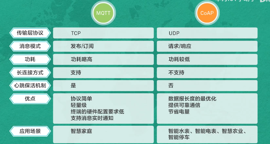 В отличие от MQTT, CoAP не поддерживает длинные соединения и не нуждается в постоянной отправке сообщений heartbeat. Когда нет никаких дел, устройству не нужно отправлять сообщения наружу. При ведении дел устройство должно сначала проснуться, и сообщения в реальном времени будут не очень удобными. По сравнению с MQTT, CoAP больше подходит для устройств, которым требуется механизм сна и пробуждения в сценариях IoT. Устройство может находиться в спящем режиме в течение длительного времени, экономя электроэнергию. Батарея может использоваться в течение 10 лет и более. В настоящее время она используется в основном в "умных" счетчиках воды и "умных" счетчиках электроэнергии. Умное сельское хозяйство, умная парковка и другие решения.