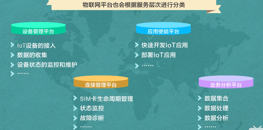 В среде IoT платформы IoT также классифицируются по уровням обслуживания. IoT-платформы в основном делятся на четыре основных типа: платформа управления устройствами, платформа управления соединениями, платформа использования приложений и платформа бизнес-анализа.