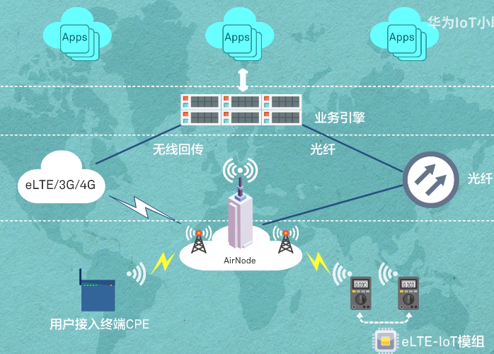 The network element equipment of eLTE-IOT includes service engine, ioT integrated base station AirNode, and user access terminal CPE. The service engine is the core convergence node of the eLTE-ioT network and mainly provides terminal equipment management, terminal AirNode access authentication, network Protocol processing, data forwarding, etc., and docking with third-party IoT applications or platforms.