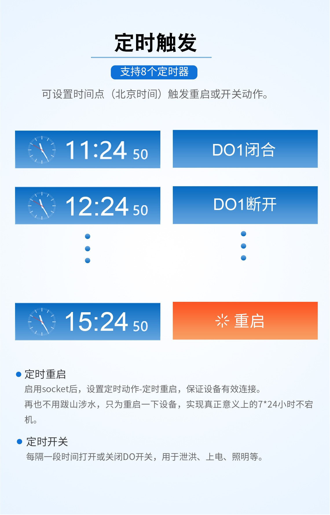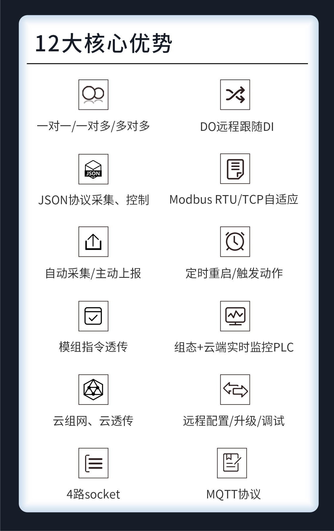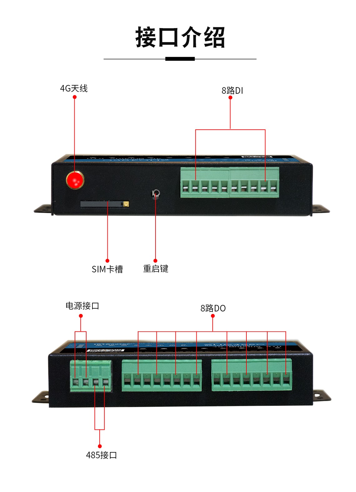 Сайт network IO controller realizes remote control function through 4G networking, and the working mode of master and slave can be freely selected; dual watchdogs of software and hardware keep the device stable online; it has good protection measures such as power overcurrent, overvoltage, and anti-reverse connection. Easy to install, easy to use and reliable. It adopts the standard Modbus RTU/TCP communication protocol and is suitable for on-site applications of various industrial monitoring. It can also be easily integrated with third-party configuration software and PLC equipment.